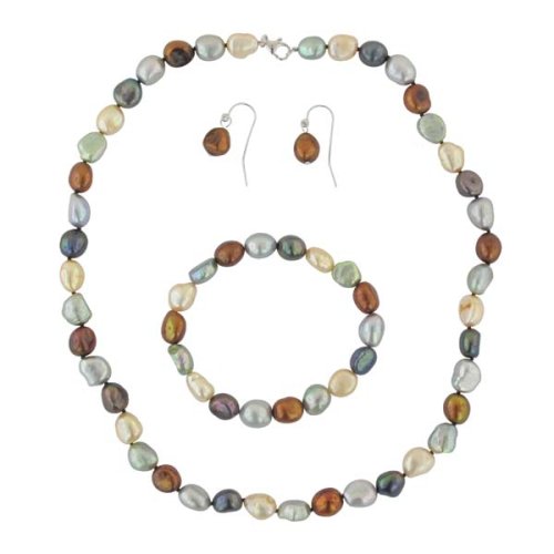 Buy Now! Champagne, Green, Chocolate Brown, Platinum Gray and Peacock Freshwater Cultured Pearl Necklace, Stretch Bracelet and Dangle Earrings Set with Sterling Silver Clasp (8.5-10mm)